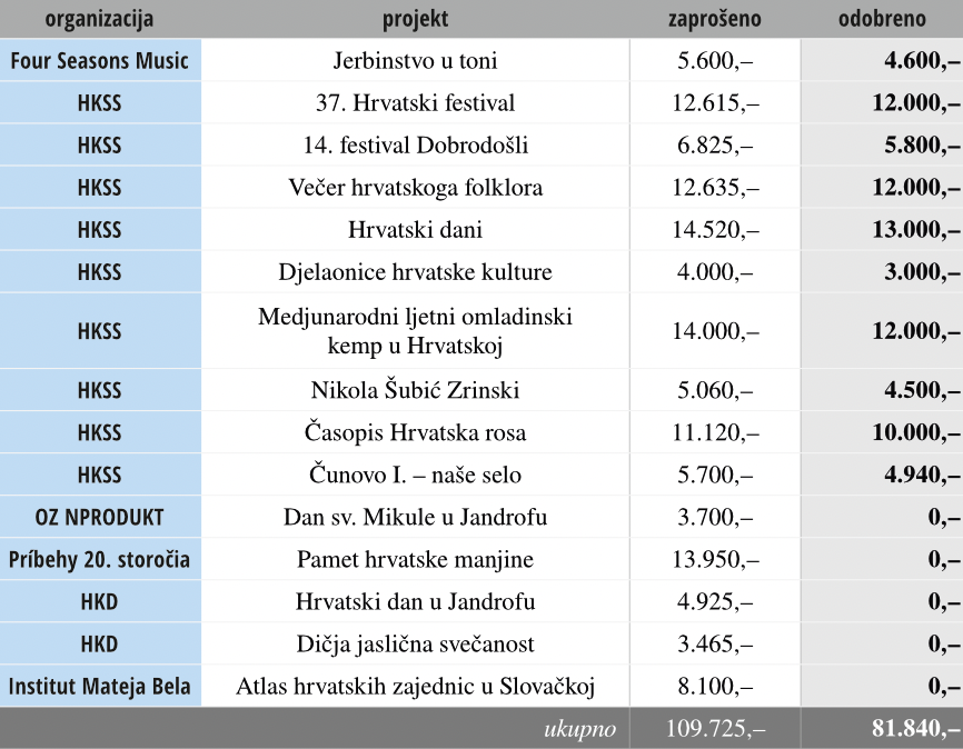 Kult.minor je objavio podupiranja za projekte hrvatske narodne grupe u Slovačkoj. Od 15 molbov su primili 10 projektov.