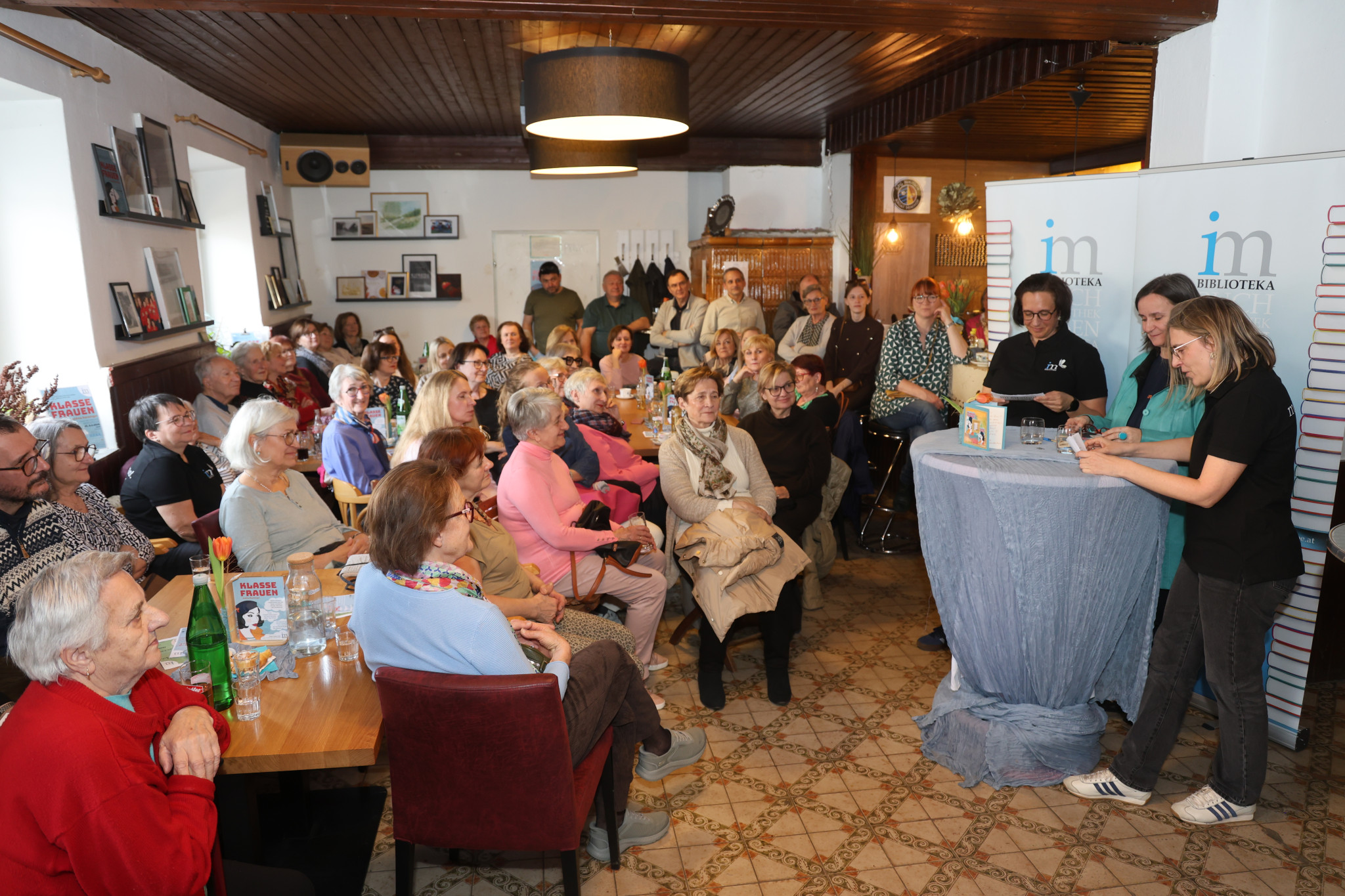 Ali i sama autorica je imala presenećenje za nje bibliotekarski tim. Skinula je jupu na kraju čitanja i onda je pokazala majicu na koj stoji na hrptu: „Hinter mir stehen KLASSE FRAUEN” (Za manom stoju izvanredne žene). Svaka je dodatno dostala s driva natpis Klasse Frauen a za muže je glasio Mann mit Klasse.