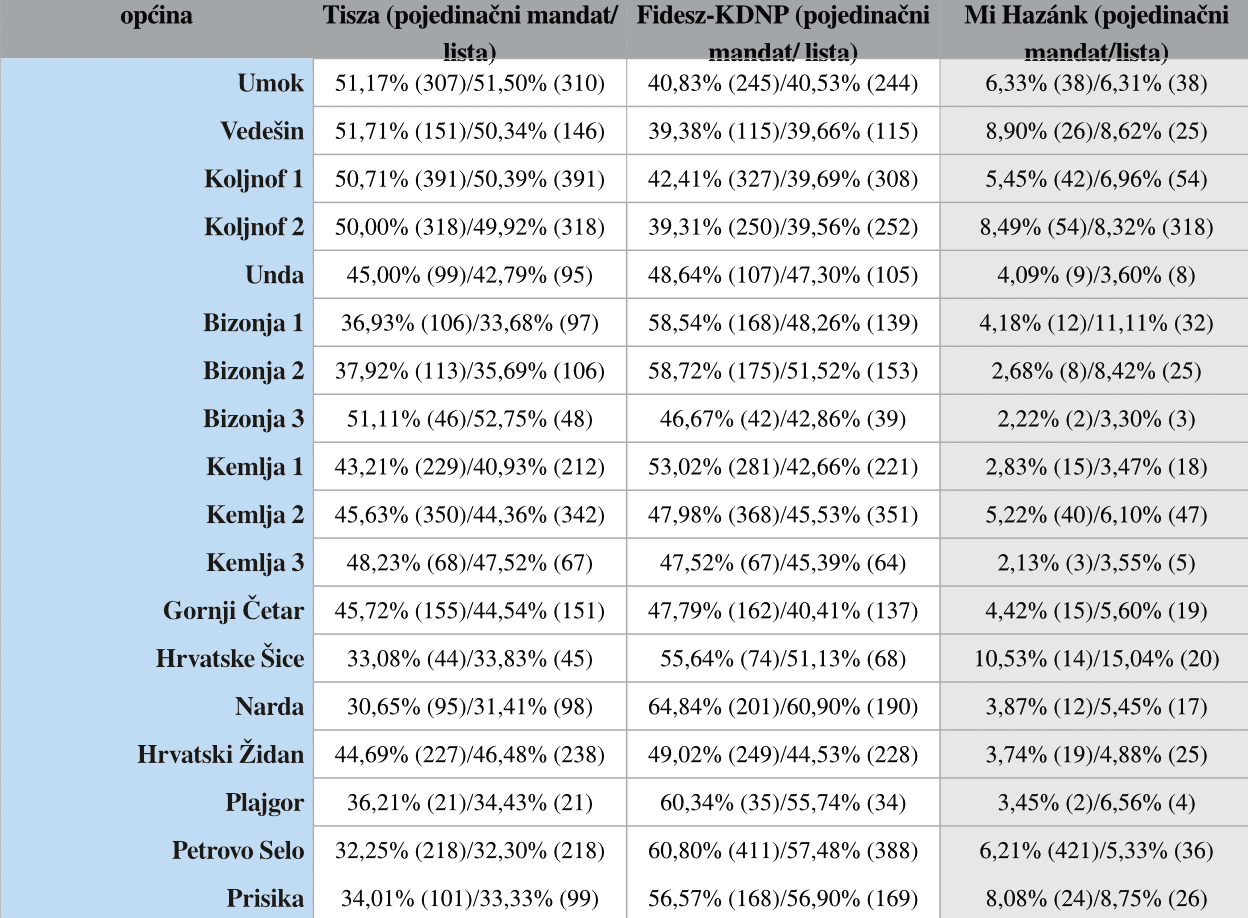 Isto tako je i stranka Mi Hazánk izgubila u neki seli ali nasuprot toga i u neki seli dobila još dodatne mandate: Umok (-1,34%), Vedešin (-0,71%), Koljnof 1 (-1,88%), Koljnof 2 (-1,85%), Unda (-1,98%), Bizonja 1 (+8,83%), Bizonja 2 (-4,24%), Bizonja 3 (+3,30%), Kemlja 1 (-0,27%), Kemlja 2 (–2,38%), Kemlja 3 (-0,58%), Gornji Četar (-2,09%), Hrvatske Šice (+9,41%), Narda (+0,29%), Hrvatski Židan (-0,83%), Plajgor (-3,11%), Petrovo Selo (+1,67%) i Prisika (+1,78%).